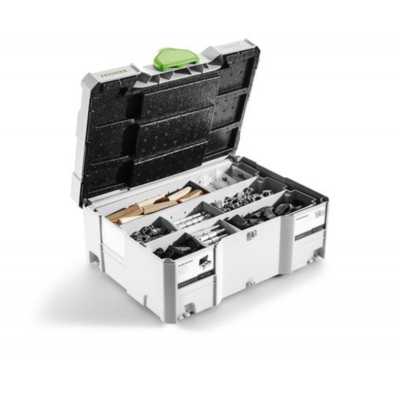 32 kotevních čepů SV-AB D14, 16 dvojitých čepů SV-DB D14, Kolík DOMINO buk D 14 × 75 32 шт., 32 rozpěrných kotev SV-SA D14, 32 příčných kotev SV-QA D14 2 шт., Kolíkový klíč vel. 4 pro utahování závitových kolíků, rozšíření SV-V D14 pro 32 příčných kotev, 32 stříbrných krytek SV-AK D14 slr, 32 tmavě hnědých krytek SV-AK D14 brn1, 32 světle hnědých krytek SV-AK D14 brn2, v Systaineru SYS 2 T-LOC